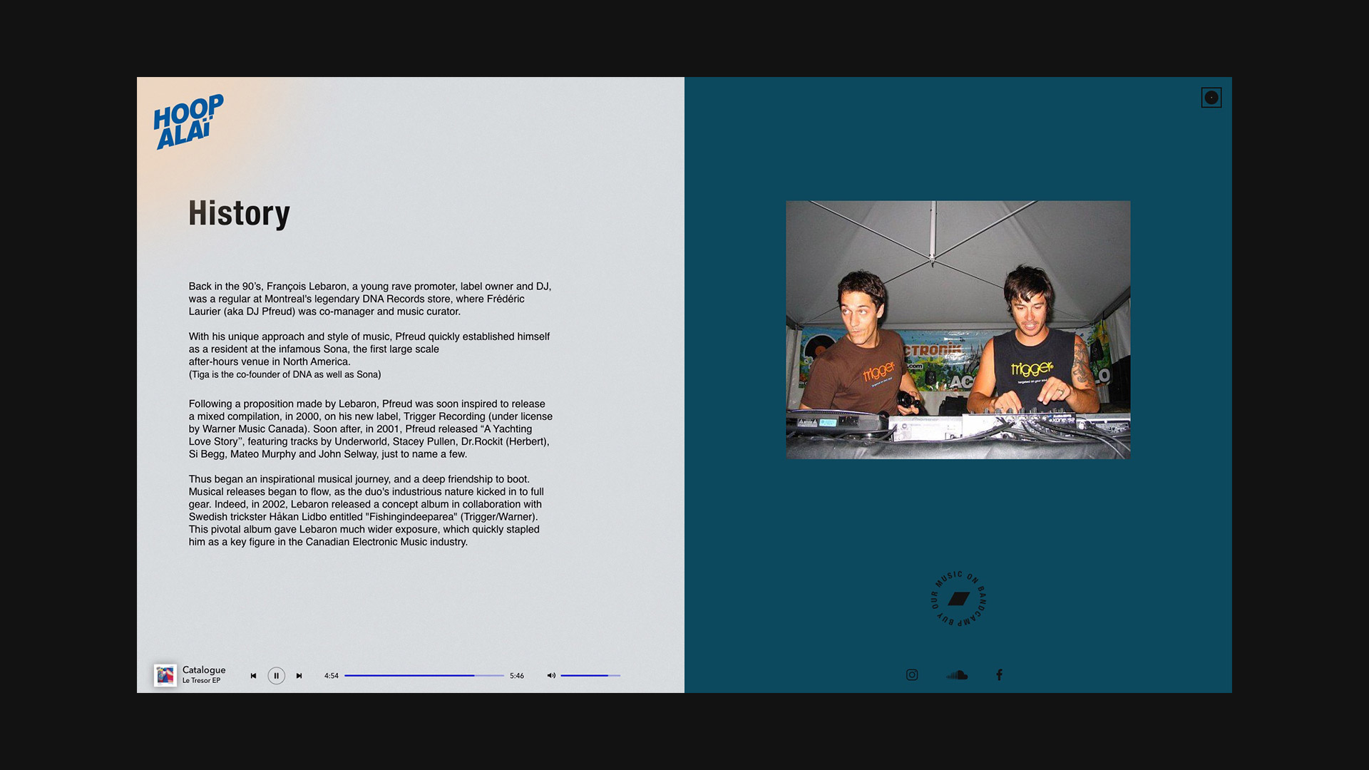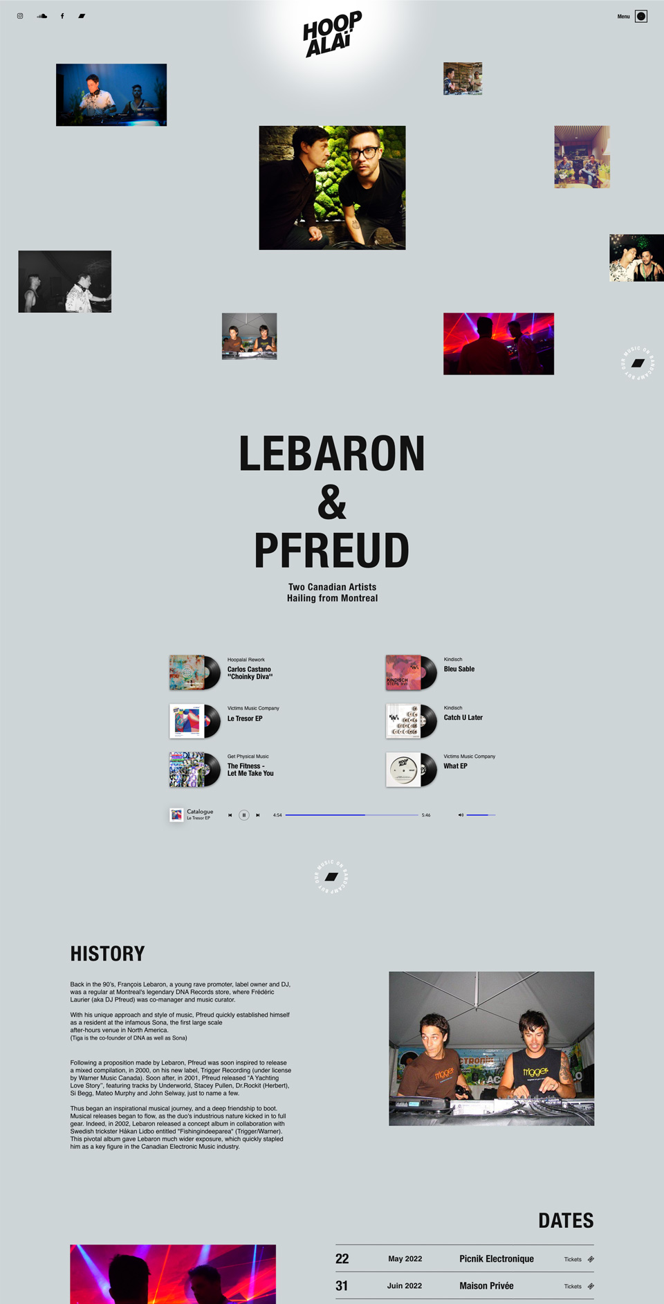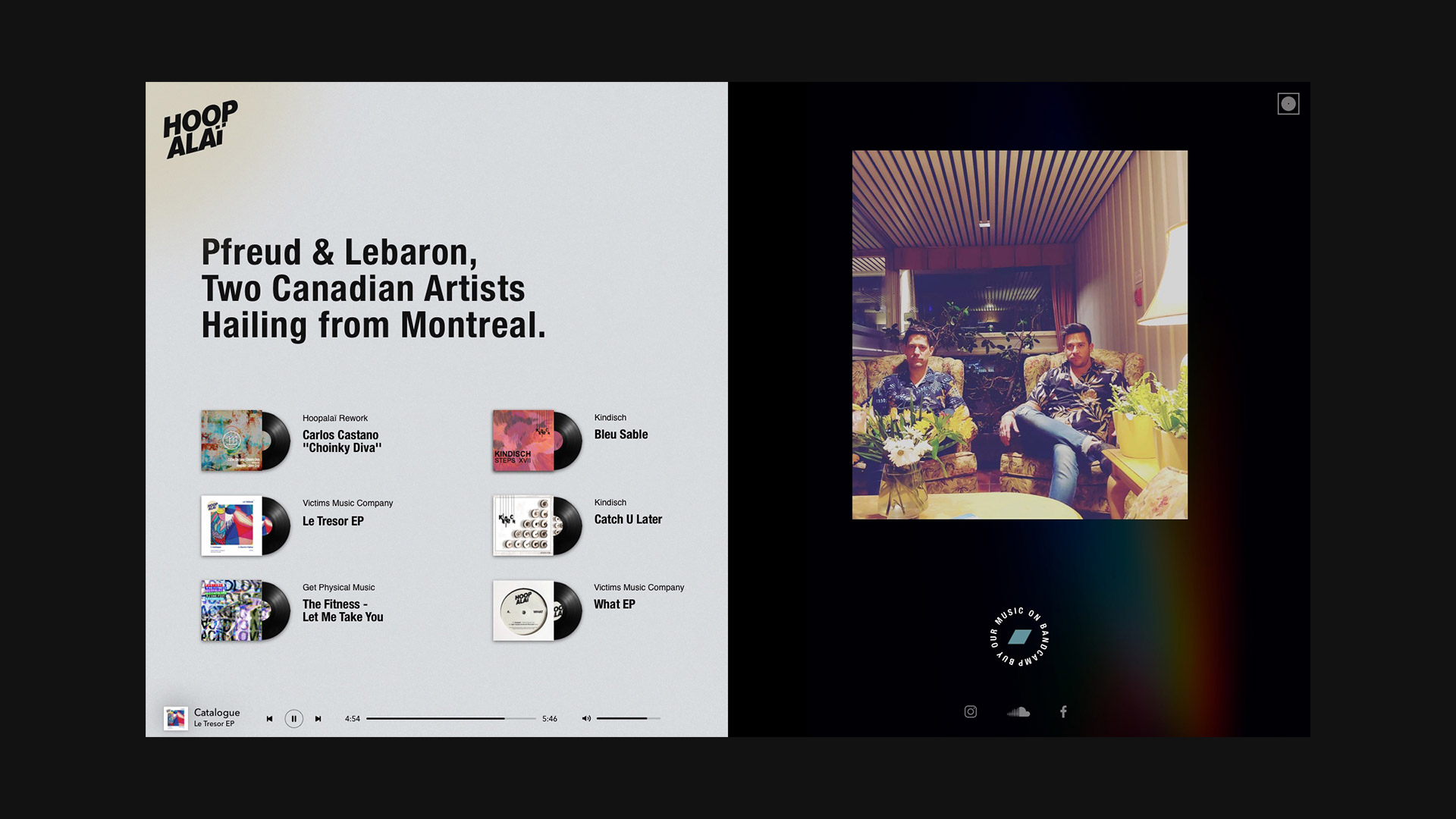HOOPALAï comprises Lebaron & Pfreud, two Canadian artists hailing from Montreal. Back in the 90’s, François Lebaron, a young rave promoter, label owner and DJ, was a regular at Montreal's legendary DNA Records store, where Frédéric Laurier (aka DJ Pfreud) was co-manager and music curator. With his unique approach and style of music, Pfreud quickly established himself as a resident at the infamous Sona, the first large scale after-hours venue in North America (world-renowned Tiga is the co-founder of DNA as well as Sona).