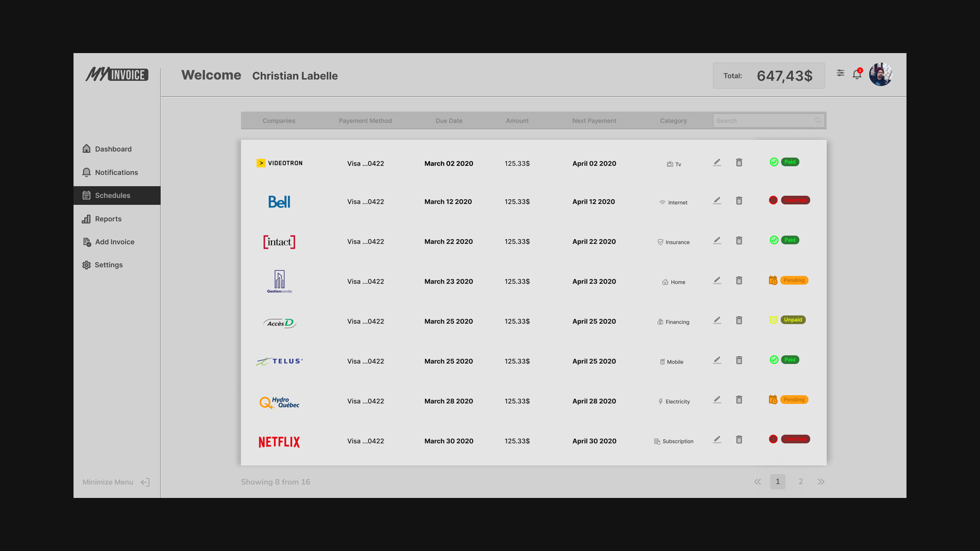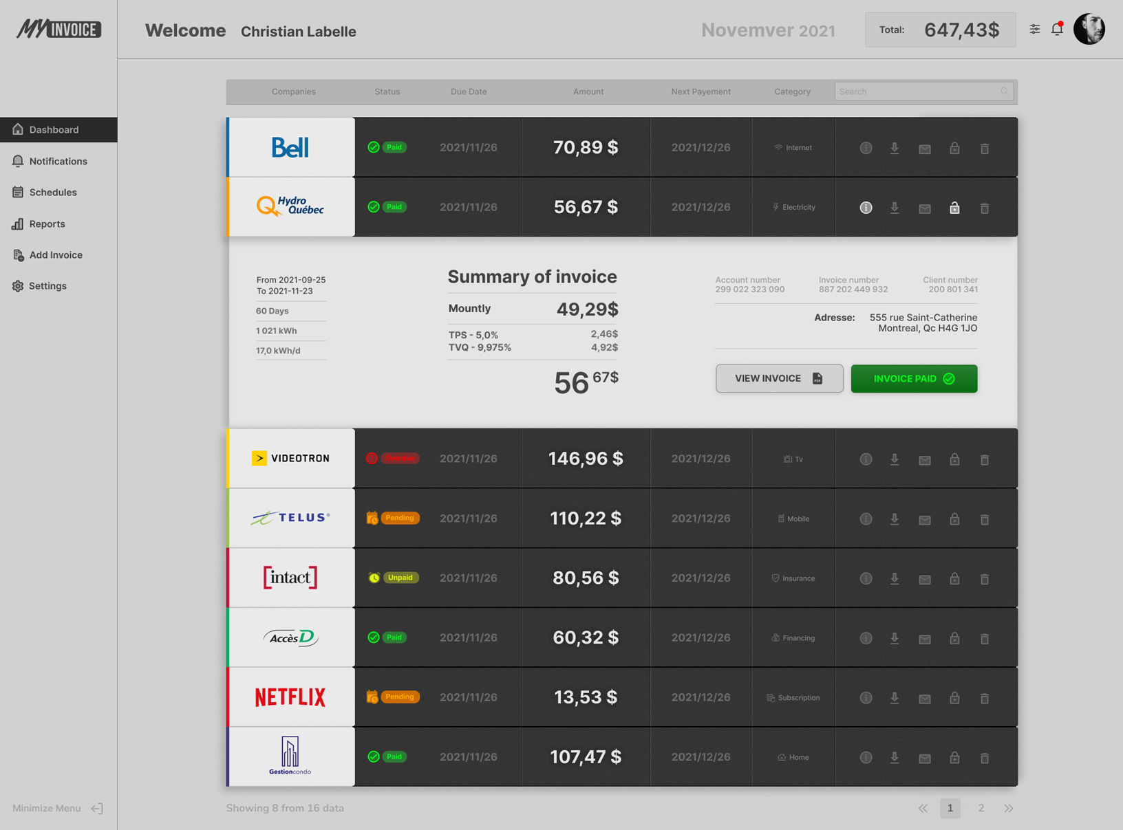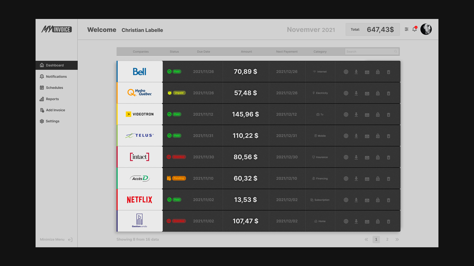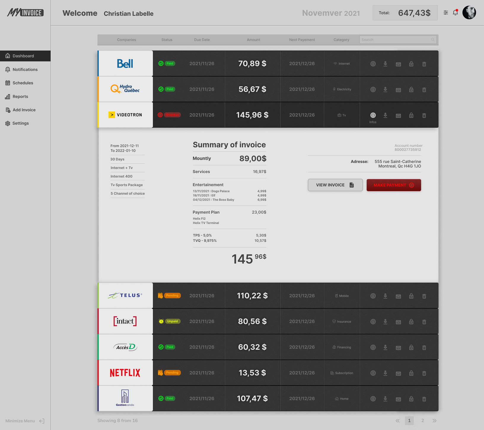 In designing a dashboard, I wanted to make it easy to manage, pay, view all my invoices in one simple way.